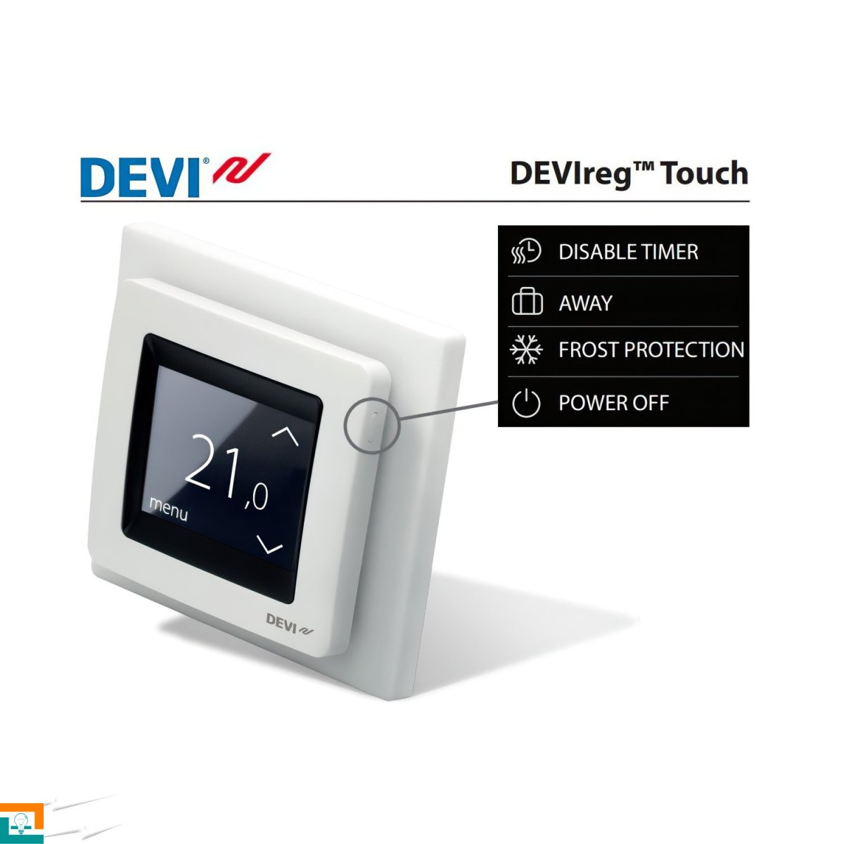 Управляйте своим теплым полом легко и просто с помощью электронного программируемого терморегулятора DEVIreg™ Touch с сенсорным дисплеем и удобным интуитивно понятным меню настроек!
