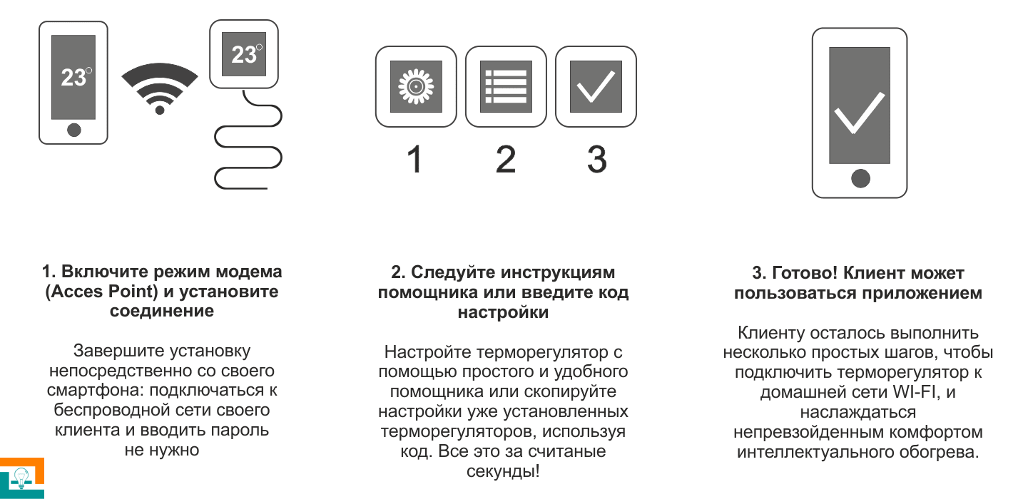 Для реализации всех функций терморегулятора нужно подключиться к сети Интернет через Wi-Fi-точку доступа. После подключения появится возможность управлять такими функциями и режимами: интеллектуальный таймер - прогноз времени включения и выключения; недельное расписание; до пяти периодов комфорта для каждого дня недели объединение терморегуляторов; выделение «Жилищной зоны» с общим расписанием; блокировки сенсорной панели; энергосберегающая функция «Открытое окно» и другие.