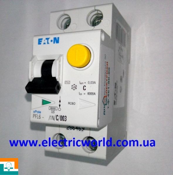 ДИФФЕРЕНЦИАЛЬНЫЙ АВТОМАТИЧЕСКИЙ ВЫКЛЮЧАТЕЛЬ 1+N-п EATON 6kA PFL6 C 20/0,03А 286468