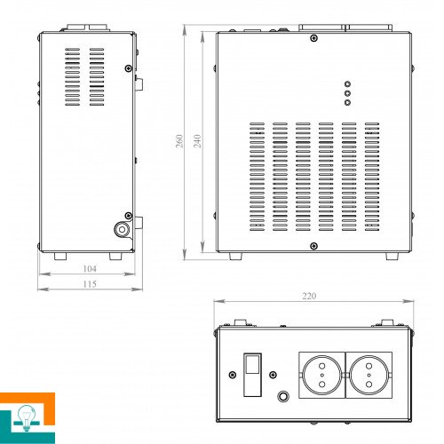 Стабилизатор напряжения вольтодобавочного типа состоит из автотрансформатора, коммутационных реле и контроллера напряжения. В процессе работы контроллер отслеживает изменение входного напряжения и в соответствии с результатами измерения переключает реле, поддерживая стабильным выходное напряжение стабилизатора. мигание светодиода зеленым цветом — старт исправного стабилизатора при входном напряжении в рабочем диапазоне; светодиод постоянно горит зеленым цветом — нормальная работа стабилизатора; светодиод постоянно горит красным цветом – стабилизатор неисправен; светодиод мигает красным цветом (1 сек горит, 5 сек не горит) — низкое входное напряжение; светодиод мигает красным цветом (1 сек горит, 1сек не горит) — высокое входное напряжение; светодиод мигает красным цветом (5 сек горит, 1сек не горит) — перегрев стабилизатора. Отсутствие индикации при включенном стабилизаторе и наличии напряжения в сети указывает на неисправность стабилизатора или необходимость замены предохранителя.